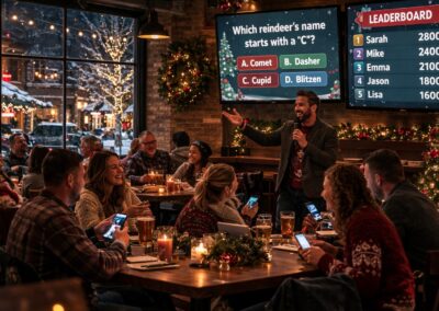 Fast-paced improv comedy gets everyone involved. Our pro-performers create hilarious scenes and audience participation that keep the energy high and the laughs coming. From improv challenges and “Level Up” competitions to holiday-themed trivia and tech-driven adventures like Spy School, these experiences encourage creativity & teamwork. The result is a lively, laugh-filled event that gets everyone participating — even the quiet ones.